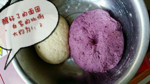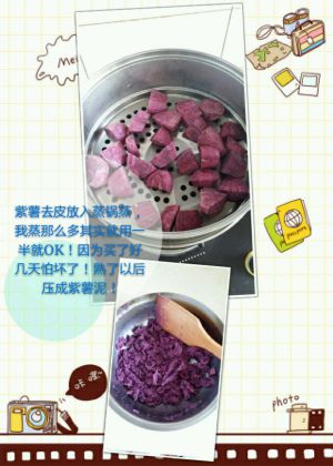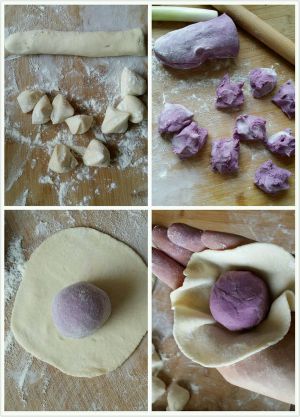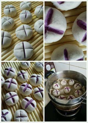贤惠一刻之养生紫薯开花馒头! 原料,紫薯,面粉(建议高筋面粉),酵母,温水 和面,一个白面面团,一个紫薯面团(做法如图一)在此酵母的量呢看图6.白面团用了一勺酵母,紫薯用了两勺,直接撒面上的,没用温水泡!揉面,这样的天气醒上五十分钟足以!图二就是醒好了以后的样子! 做法看图就行,建议白面皮擀的和饺子皮差不多就行,我擀的有点薄,蒸出来不是特好看,把紫面团放白面皮里面,像包包子似得包起来,口在下面,然后用一个快的刀划十字,不要像我划的太长,高筋面粉的话开锅会开花太长不好看!蒸锅水开后放馒头大火蒸,十五分钟即可,因为我做的小!中间不要开盖! 紫薯的营养大家肯定都知道,如果蒸熟了直接吃会觉得太干了,这样做成馒头,不仅会避免这种情况,而且还能增加宝宝和家人的食欲,何乐而不为