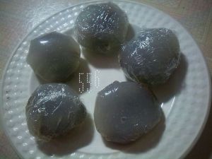 保鲜膜裁好放入小茶杯中,先放一汤勺淀粉稠浆,再放一份10g的豆沙,然后放上剩余的淀粉稠浆,提起保鲜膜边缘,包成球状,放入冰箱冷藏即可(不放入冰箱也可以,成色相对更透明,但放入冰箱口感更好)