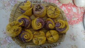 7、最后剩面做了几个玫瑰花馒头和南瓜馒头,并且将核桃仁包到馒头中做馅。