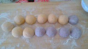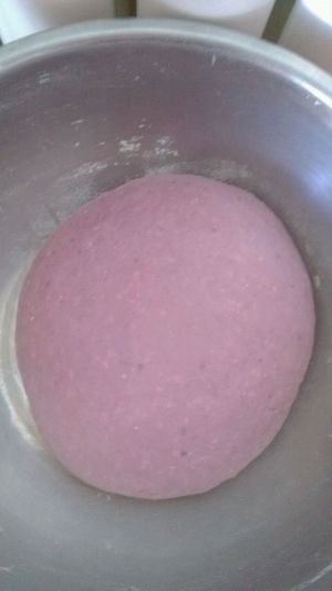 两种面分别发好后取两个白色面团,一个25克,一个35克,紫薯面团25克,全部揉成圆形。