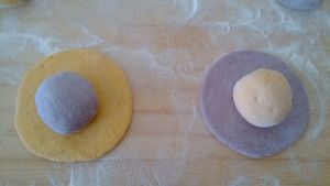 白色的两块面团分别擀成圆形面皮,大的放下面,把紫色面团包在中间,周围压紧。