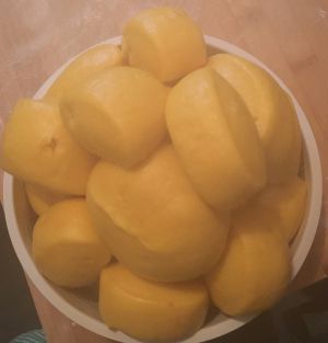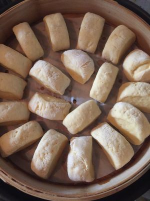 我也是醉了,其他的部分,忘了拍照,可以看我之前的那个菜谱有,就是面发好进行排气,加小苏打揉,最后切成你要做的馒头大小。图中是切好,放温水锅第二次发酵,大约20分钟,就变得大了一倍,然后开火蒸。