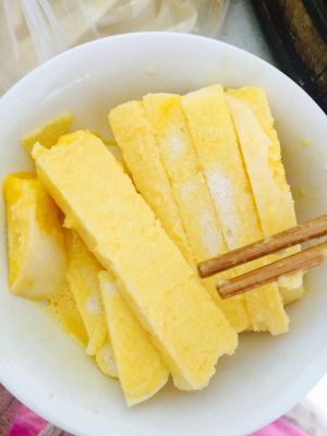蒸好的馒头,切成一条一条的,由于时间问题,所以没留照片