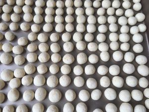 将牛奶和面粉混合,搅成絮状,然后揉成如图所示面团,揉面过程中如果很粘手,可适当加入一点面粉,揉成如图所示盆光,手光的样子
