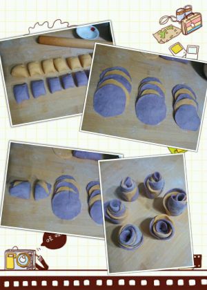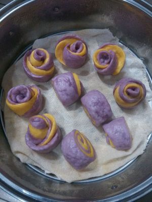 剩下面团平均等份,擀圆片,颜色错开,依次叠放,上压下,用筷子在面片中间清轧一道,从下自上卷好。在卷儿中间切一刀,立起整形。(备注:灯光角度问题,紫薯颜色很奇怪。)