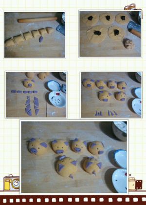 面团多揉一会排气后,取二分之一南瓜面团,搓成长条,平均分6份。擀成中间厚、边缘薄的圆片,放豆沙馅,像捏包子一样包好馅,褶子口捏紧封口朝下,整形猪头主体。取一小条紫薯面团,分别做成猪头的耳朵、嘴巴、尾巴,蘸水粘在猪头上。用牙签分别蘸水蘸黑芝麻戳在面团相应部位,做猪头的眼睛,鼻孔。
