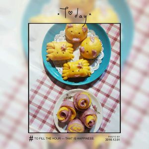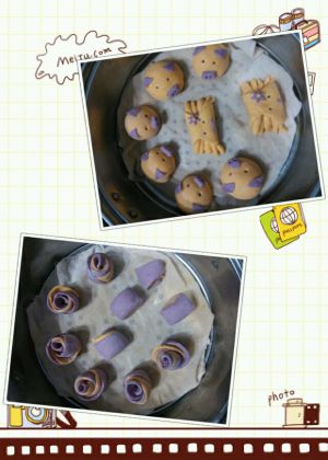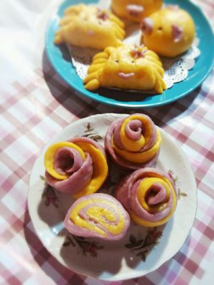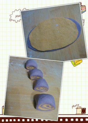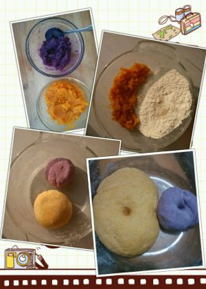 南瓜、紫薯用小勺碾成泥儿,趁温热时,分别加酵母粉和成面团(南瓜水分大的不用加水;紫薯较干,加水),面团放在盆里,盖盖置于暖气上。2个多小时后发酵,用手指戳一下面团,有弹性、不回缩即发酵合适。