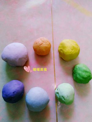 面粉分七份分别加入七色的汁或者泥加酵母和成面团,紫薯 胡萝卜比较干加点水。面团发酵两倍大