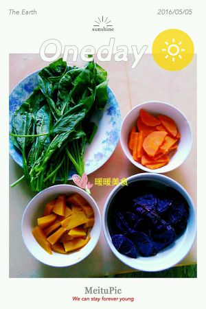 准备好各种蔬菜紫薯 胡萝卜 南瓜切小块蒸熟备用
