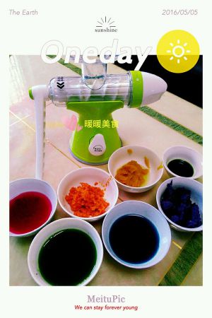 原汁机把菠菜榨汁, 紫薯 南瓜 胡萝卜原汁机摇成泥,菠菜汁分两份一份加水稀释,紫薯泥分三份一份加水融化加柠檬汁变红色,一份加水融化加小苏打变蓝色。彩虹七色出现啦
