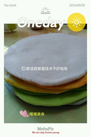 发好后把七色面团排气擀成圆形按赤 橙 黄 绿 青 蓝 紫叠加放好,叠加时可抹点水使其更好的贴合。放置二十分钟再次发酵后放入蒸锅水开十五分钟就熟啦!