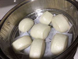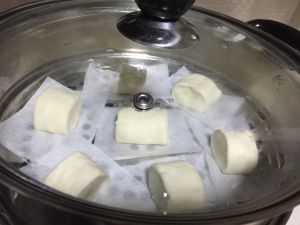 二次醒发20分钟后开始大火蒸,当上汽后再继续蒸20分钟,关火后再焖3分钟再掀开盖,以免回缩。