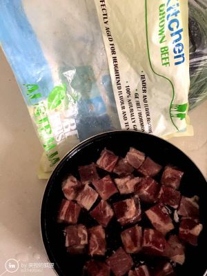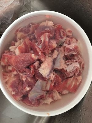 牛腩拿出解冻。老公挑剔,国内的嫌不好吃,家里的都是给他弄的新西兰的牛腩。牛腩冷水下锅,倒入少许料酒,大火烧开,转小火煮三分钟,捞出。