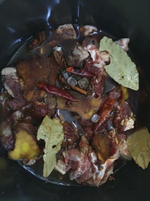 然后加入适量水、盐、生抽、老抽、蚝油、黄酒、白醋、冰糖,最后放入电压力锅炖1个小时