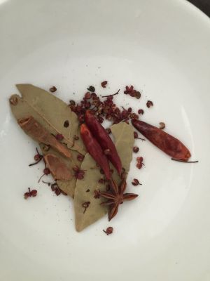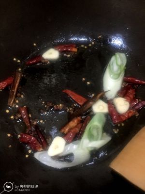 锅内坐油,干辣椒八角花椒蒜瓣大葱肉桂,蒜瓣,大葱,八角放一半就好。炒香,捞出留油。