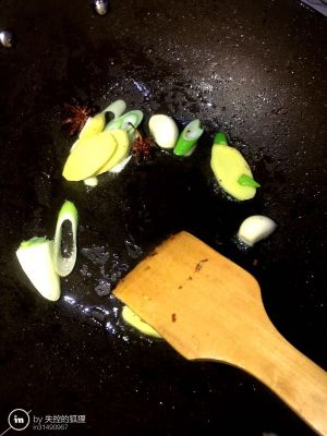 再次放油,加入大葱,蒜瓣,八角,炒出香味。