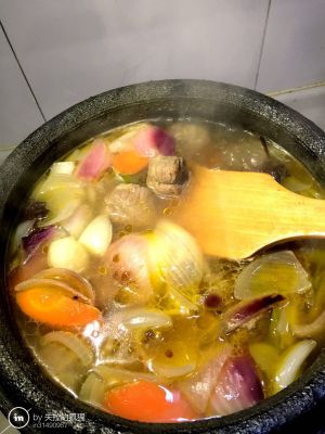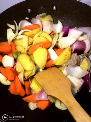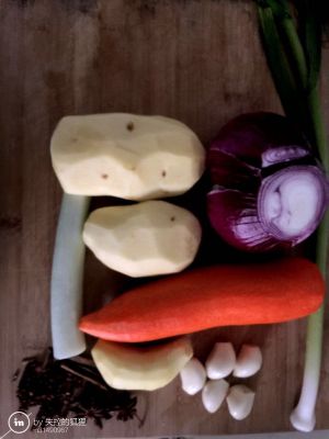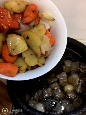 炖一个小时至牛腩入味,中间不要加任何盐以及调味品。一小时后加入刚刚炒制的土豆胡萝卜洋葱。