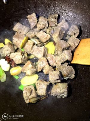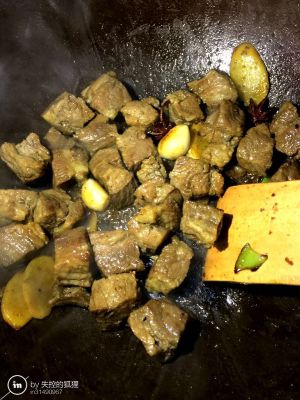 另起一锅,锅热后倒油,油温7成热时放牛腩炒出香味,然后加入姜片,八角,香叶,花椒,干辣椒炒匀。当调料炒出香味后,烹入料油炒匀。再倒入老抽,盐,糖炒匀,最后加水没过牛腩煮开。