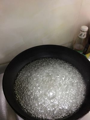 3勺白棉糖倒入水,糖和水比例是1:3。熬至糖粘稠和金黄色即可。