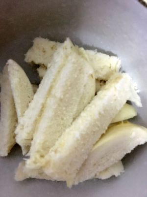 把放在冰箱冷冻过的馒头拿出来,切片。薄厚尽可能均匀,不然受热不均,摆盘很丑。
