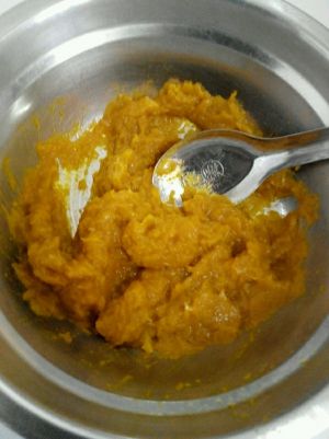 南瓜用勺子压成南瓜泥,放一边冷却到30度左右。