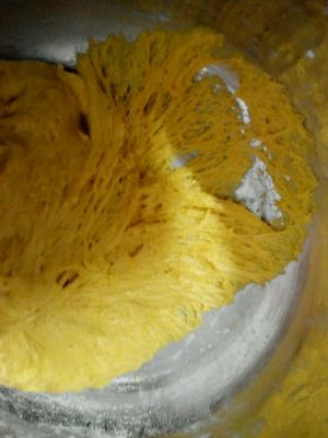 南瓜泥冷却后倒入面粉中,同时把酵母水和白糖一起放入面粉中搅拌,如果太干加点水,太湿就加点面粉。