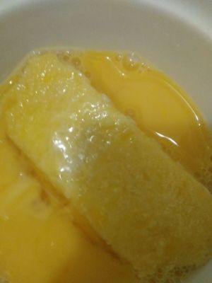 把馒头片放入蛋液里,让蛋液全部包裹住馒头