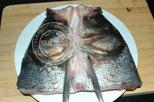 鱼头洗净沥干水分,在鱼肉部分斜切两刀.鱼肉下面垫姜片和葱段,放适量料酒.