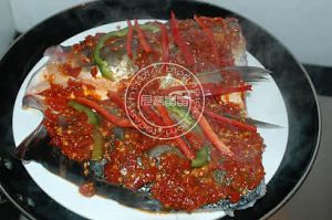 将剁椒平铺在鱼头上,上锅蒸15-20分钟