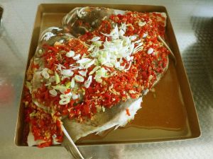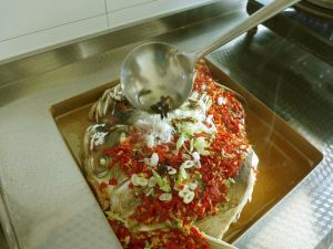 锅里烧开水后,放入鱼头隔水蒸5分钟后倒掉腥水,在鱼头上铺上剁辣椒和炒好的姜蒜,再大火蒸15分钟。