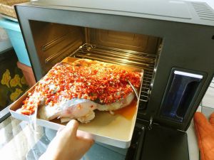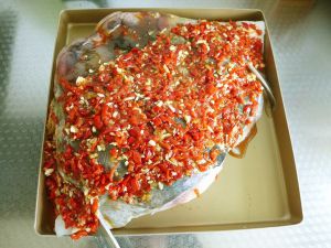 将拌好的剁椒平铺到盘子中的鱼头上;