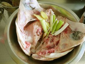 将葱切段,生姜切片放入鱼头内,继续入味30分钟;