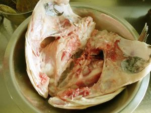 买回的鱼头冲洗干净(已去除鱼鳃等内物),从鱼下巴那一面竖着从中间劈开成相连的两半;
