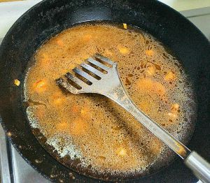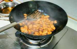 把火调到小火,不断的翻搅,让糖化掉。