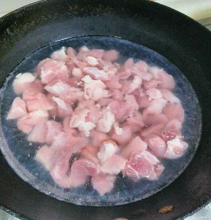 肉切块,放入锅中,冷水没过肉块两厘米。沸腾后再煮五~六分钟