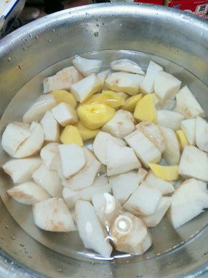 山药和土豆削皮切块,泡在水里防止氧化。