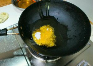 放入少量油,蒜片、姜丝、红椒、白糖爆香