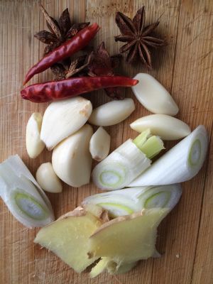 在煮肉的期间,把蒜切成片,葱,姜都切好。