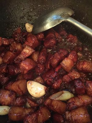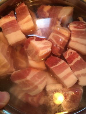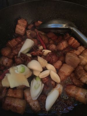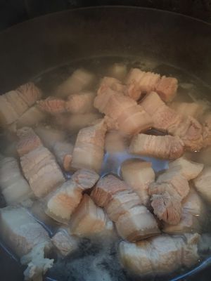 炒锅放油和白糖,小火慢慢熬至大泡变小泡,小泡快没的时候,放入五花肉快速翻炒,使每块肉都染上糖色,到入沫过肉的开水,放点料酒,整锅倒入高压锅里,上气后转小火煮十分钟关火,