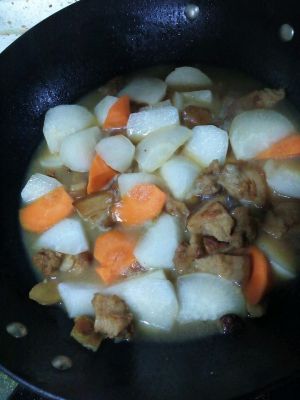 加入萝卜,盐,中火煮至收汁即可。加萝卜时如果水太少没不过去,可以再加点开水,快出锅时颜色不够再加点老抽。