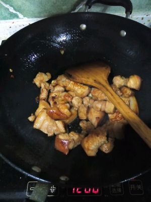 锅里加入油20克,倒入所有配料炒出香味,再加入炸好的五花肉,慢慢地翻炒。加入料酒两勺20g,生抽两勺20g,老抽一勺5g,盐一勺5g,再倒入糖色。