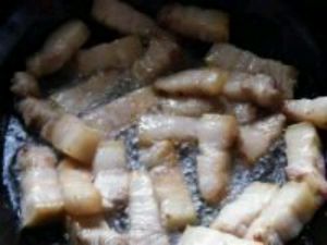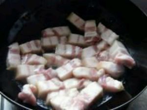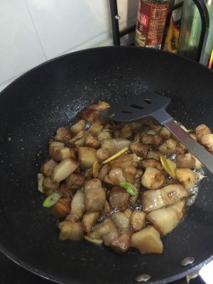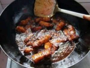 放少许油加冰糖 炒糖色儿 将糖炒制变色 到入五花肉 充分翻炒 加葱姜