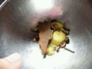 4. 姜切块,准备好桂皮一个、八角一个,草果2 个,丁香2个