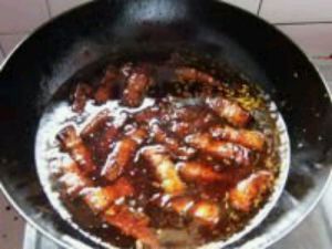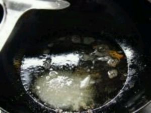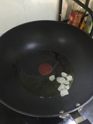 7. 锅内剩下的油烧热,放入30克白糖,小火烧至糖溶化,呈浅咖啡色鱼眼泡状