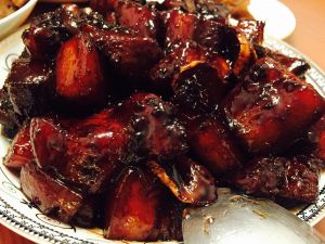 五花肉些大块焯水。焯肉的水中放料酒、姜片,在水将开未开的状态下,放入肉,开锅后除去血水。将肉捞出后晾凉备用。