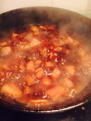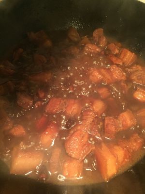 锅中放少许油放入姜片、大料炒香,放入肉煸出油,放少许料酒,等料酒挥发后,放入黄片冰糖继续炒,待冰糖基本融化后加入老抽上色,生抽调味,加温水炖,大火开锅后改小火盖上锅盖慢炖。可放少许陈皮加速肉的软化。