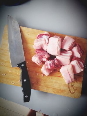 一斤带皮五花肉,切成块,不要太小哦,煮熟会有点缩水(切肉方知有个好家伙事的重要性啊,累死我了),放凉水和肉一起下锅汆水,捞出肉,倒掉血水