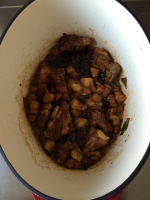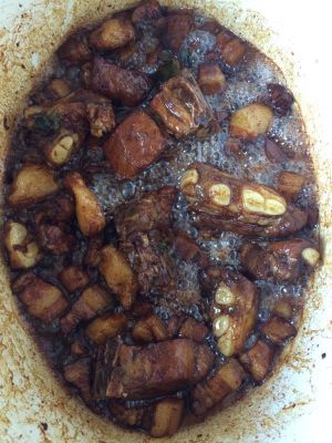 放油,将冰糖熬成焦糖色,放肉上色。然后将猪肉放一边,再加一点油,将调料放进去炒香,最后加足汤水!