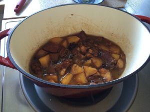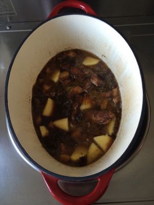 看好了 如果干了就加点水 保证不要糊掉,我这次就有些糊掉了!都怪分散注意力了!炖了一个小时!出锅前把香菜和葱切末放进去拌匀出香味!