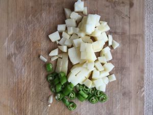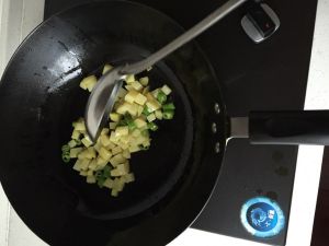 放少许油,土豆青椒下锅,炒至土豆能用铲子切断